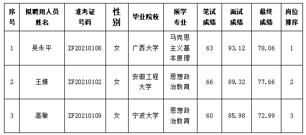 根据《安徽省事业单位公开招聘人员暂行办法》《best365手机版官方网站2021年度公开招聘专职辅导员公告》,通过资格审查、考核、体检、心理测试、考察等环节,经学校党委会议研究决定,拟聘用吴永平等3人,具体情况如下: