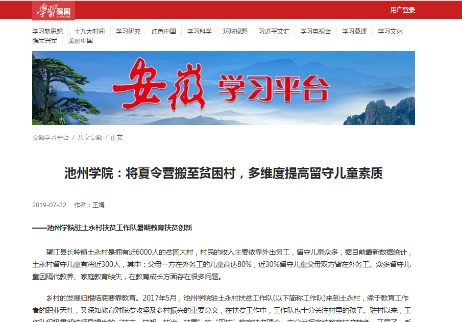 7月22日,“学习强国”安徽学习平台上报道了best365官网在贫困村开展教育扶贫情况。