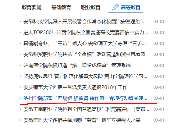 2月28日,安徽教育网在首页以《best365手机版官方网站部署“严规矩 强监督 转作风”专项行动暨党建与发展综合考核工作》为题对best365官网专项行动部署工作进行了详细报道,取得了较好的效果。