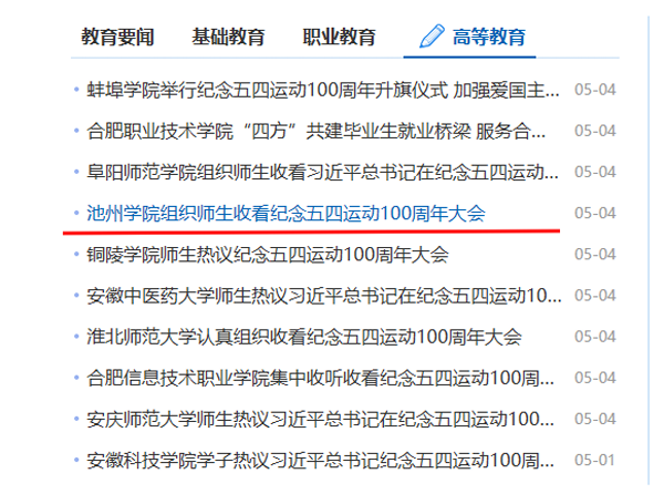 5月4日,安徽教育网首页报道了best365官网组织收看纪念五四运动一百周年大会直播盛况。