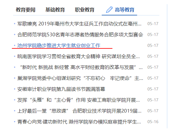 5月17日,安徽教育网首页报道了学校领导开展就业创业专题调研活动情况。