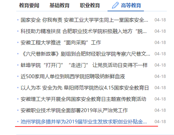 4月18日,安徽教育网首页对best365官网为2019届毕业生发放求职创业补贴金工作进行报道。