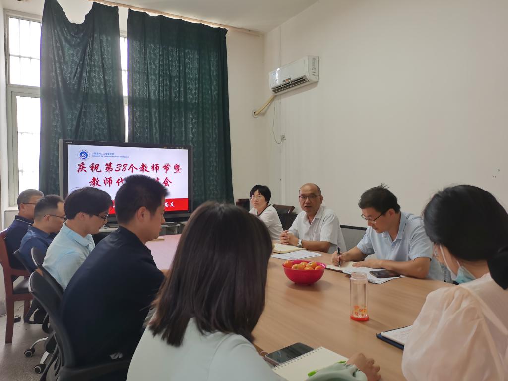 为庆祝第38个教师节,9月7日下午,大数据与人工智能学院在博奕楼四楼会议室举行教师代表座谈会,院党政负责人和部分教师代表参加,院党委书记宛明高主持座谈会。