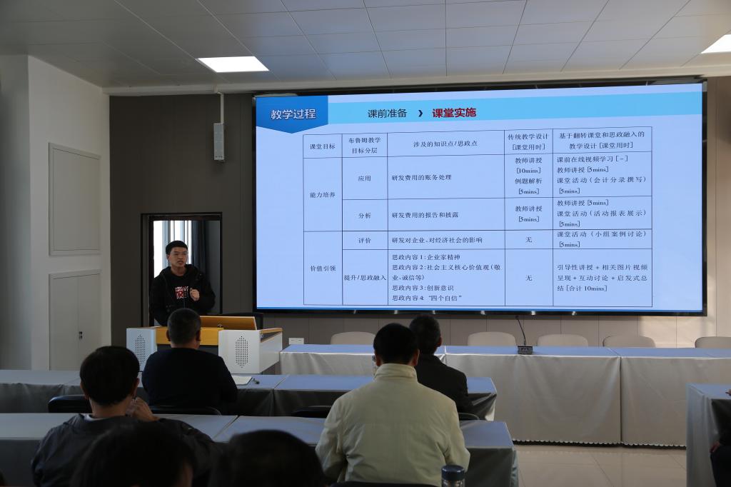 吴铖铖基于《中级财务会计学》课程从教学分析、教学设计、教学过程、教学反思四个方面分享了他所做的课程思政实践探索;胡鹏基于《西方经济学》课程从什么是课程思政、为什么要进行课程思政、进行课程思政教学设计与实践的必要性、课程思政教学设计、课程思政教学实践等几个方面分享了他的经验;徐家洪基于《SPSS数据统计与分析》课程阐述了他的课程育人理念和教学实践;王剑程从课程思政的内涵、课程思政建设“1234”原则、《电子商务概论》课程思政建设三个方面分享了他的课程思政教学理念和经验;杨群基于《公共关系学》课程从课程思政教学目标、课程思政教学实施、课程思政教学反思三个方面提出了她对于课程思政建设的思考。