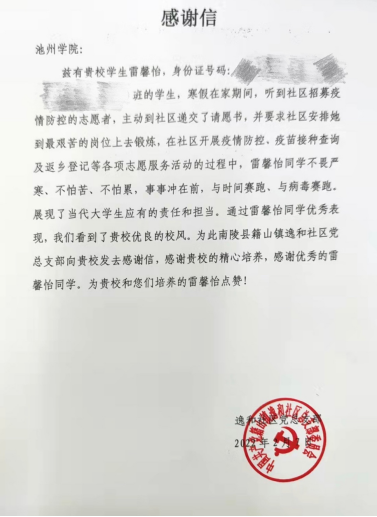 2022年寒假期间,best365官网2021级汉语言文学1班雷馨怡同学积极响应南陵县籍山镇逸和社区招募志愿者的号召,并积极要求安排她到最艰苦的岗位上去锻炼,在社区开展疫情防控、疫苗接种查询及返乡登记等各项志愿服务活动中不怕苦、不怕累,事事冲在前,受到南陵县籍山镇逸和社区党总支部通报表扬。
