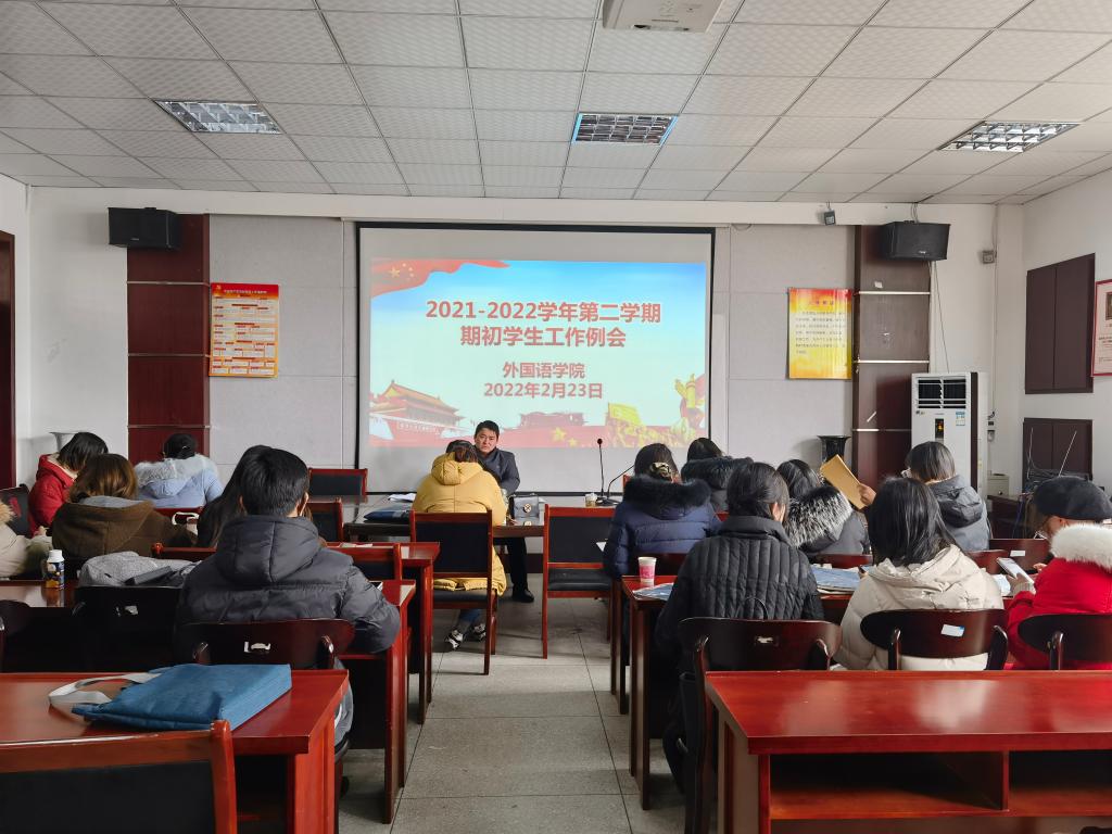 2月23日下午,外国语学院在会议室举行学生工作例会,部署新学期学生工作。外国语学院党委书记张乐民出席会议,全体辅导员参加了会议。会议由外国语学院党委副书记刘军主持。
