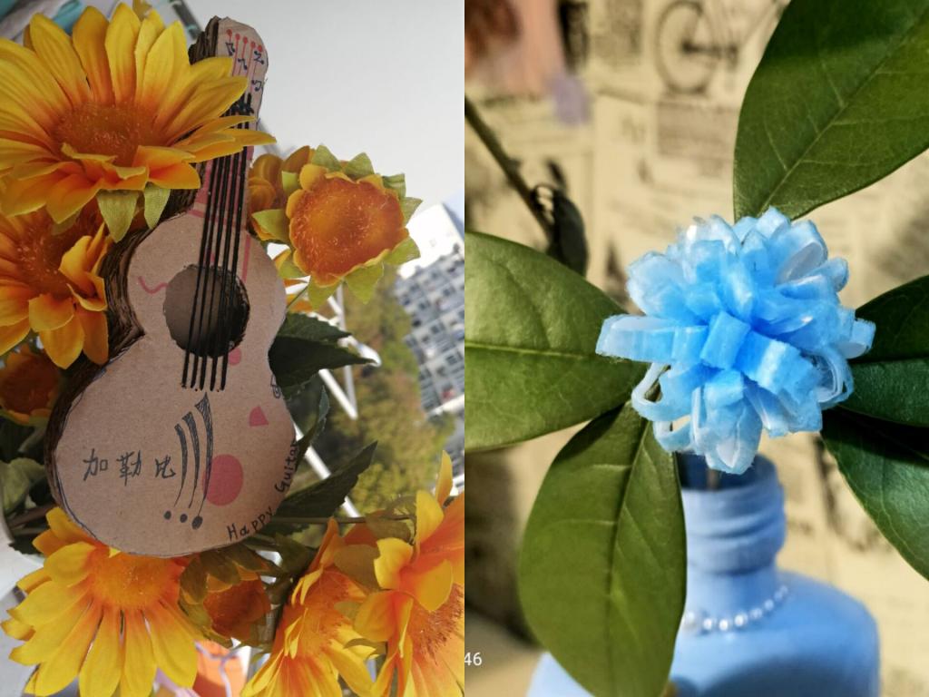 同学们积极参与,纷纷利用身边废弃的物品进行再创作,废纸盒做出的纸飞机借以表达对东航遇难者的沉痛哀悼,做出漂亮的“寻梦瓶”让宿舍也“春意盎然”,还有漂亮的尤克里里、手工电扇......造型精致又可爱。