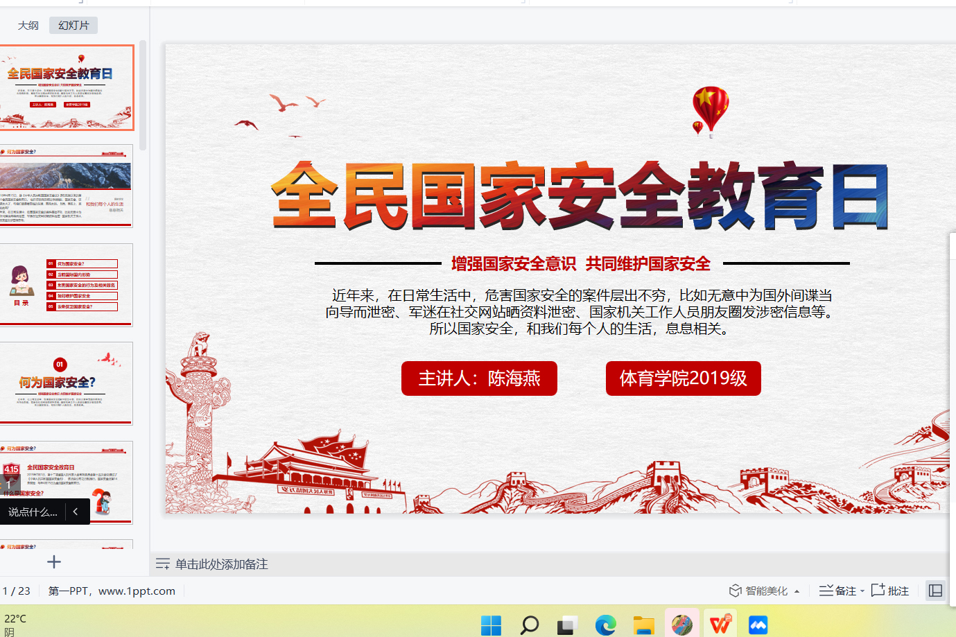 同上一堂国家安全教育课。今年的活动主题是“树牢总体国家安全观,感悟新时代国家安全成就,为迎接党的二十大胜利召开营造良好氛围”。体育学院高度重视,密切安排,要求全体师生同上一堂国家安全教育课,使学院全体师生的国家安全意识得到进一步加强。