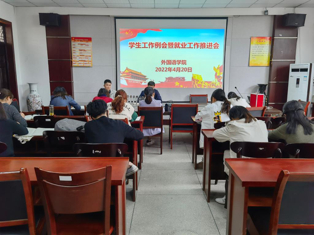 4月20日下午,外国语学院在会议室举行学生工作例会暨就业工作推进会。外国语学院党委书记张乐民、院长余义兵和全体辅导员参加了会议。会议由外国语学院党委副书记刘军主持。