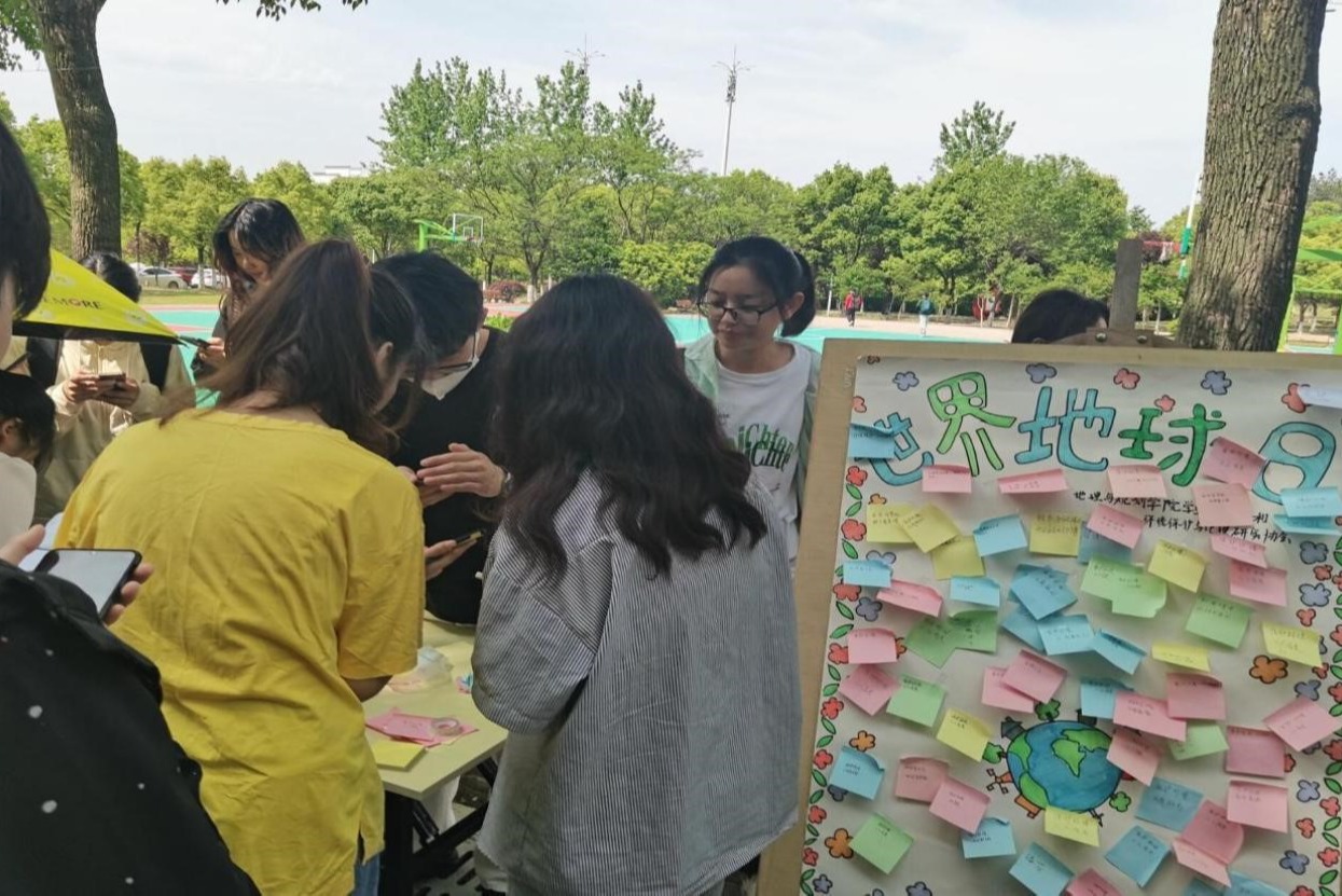 “环保大家谈,地球共保护”活动分为线上与线下两部分。线上活动要求同学们线上发布关于与环境保护知识有关的知识,推广节约资源的理念。线下活动于4月22日上午在一食堂门口举行,同学们通过回答关于环保相关问题获得小奖品,并写下自己的环保标语进行展示。