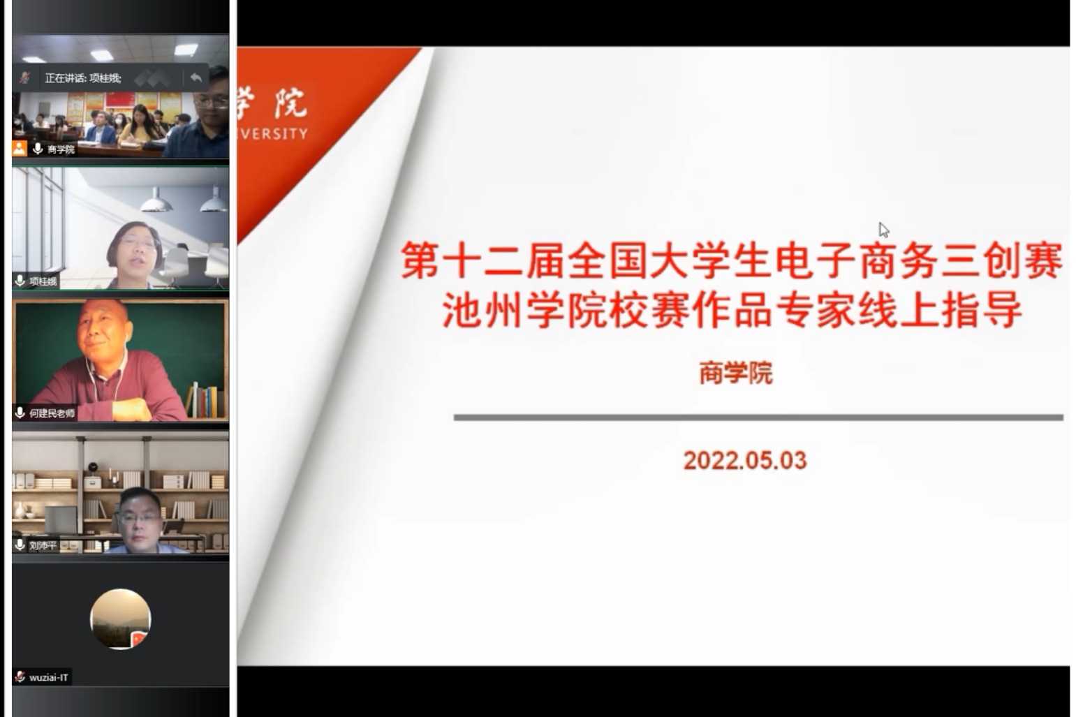 5月3日晚上,商学院在博识南二楼会议室举行第十二届全国大学生电子商务“三创”赛校赛作品专家线上指导。活动邀请了合肥工业大学管理学院教授何建民、合肥学院大学生创新创业教育中心主任刘沛平两位专家进行线上指导。活动由副院长吴自爱主持,院长项桂娥、校赛获奖团队和指导老师等参加了活动。