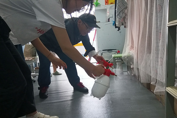 学院通知学生将宿舍内堆放的物品清理出宿舍(摆放在楼道内),彻底清理卫生死角,垃圾及时清理出宿舍楼。学院分管学生工作领导与后勤管理与基建处相关人员对接,安排辅导员从宿舍管理员处领取消毒液,对宿舍内进行消毒,确保清扫一间,消杀一间。