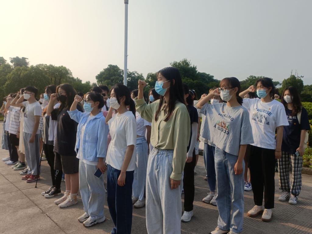 仪式第四项,重温入团誓词。在文学与传媒学院团委学生副书记黄金玉同学的带领下,面向团旗重温入团誓词。