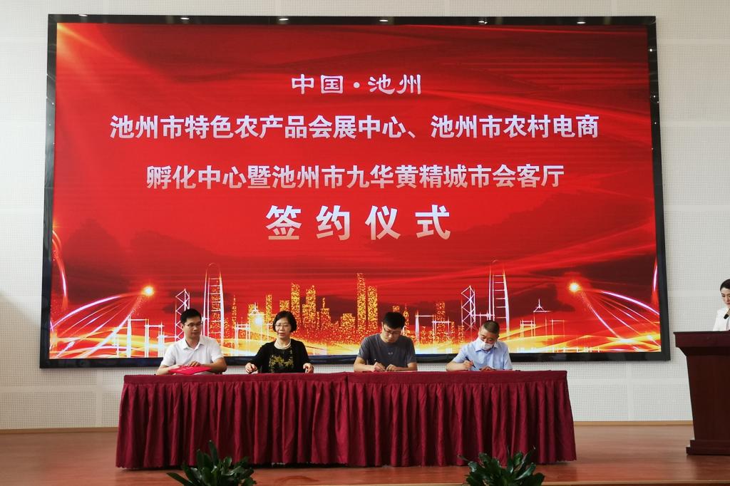 开业典礼由池州产业投资集团、池州乡村振兴产业发展公司、安徽黄精交易市场管理公司、安徽皖美池久健康产业发展公司联合举办。项桂娥代表商学院与池州乡村振兴产业发展公司签订定战略合作协议,未来双方将携手建立以助力乡村振兴为目标,以大学为依托,产教融合助力乡村振兴的协同发展模式,在大学生实践教学、农村电商培训、产学合作等方面开展广泛的校企合作。