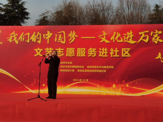 为深入学习贯彻党的十九届六中全会和安徽省第十一次党代会精神,活跃群众文化生活,以艺术化的形式将全会和省党代会精神送入千家万户,艺术与教育学院师生分别于12月9、10日 在贵池区墩上街道社区和百荷园社区开展“我们的中国梦—文化进万家”文艺演出活动。