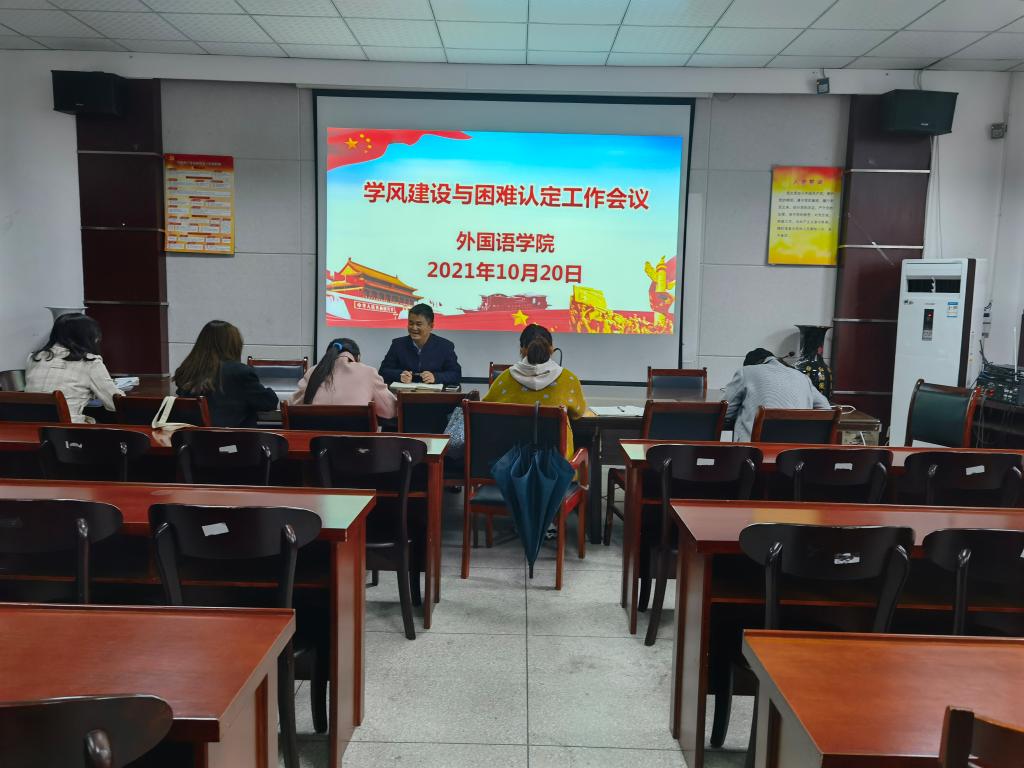 10月20日下午,外国语学院在会议室举行学风建设暨困难认定工作会议。外国语学院全体辅导员参加了会议。会议由院党委副书记刘军主持。