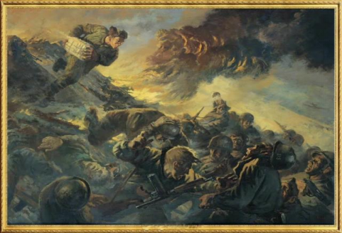 学生预备党员孙艺文讲述的是宗其香创作的油画作品《不朽的英雄杨根思》,这幅作品采用了突破常规的不平衡的构图方式,抓住了最具戏剧性冲突的场景。作品在写实风格中融入了夸张的手法,再现了当时充满速度感和爆发力的一刻。