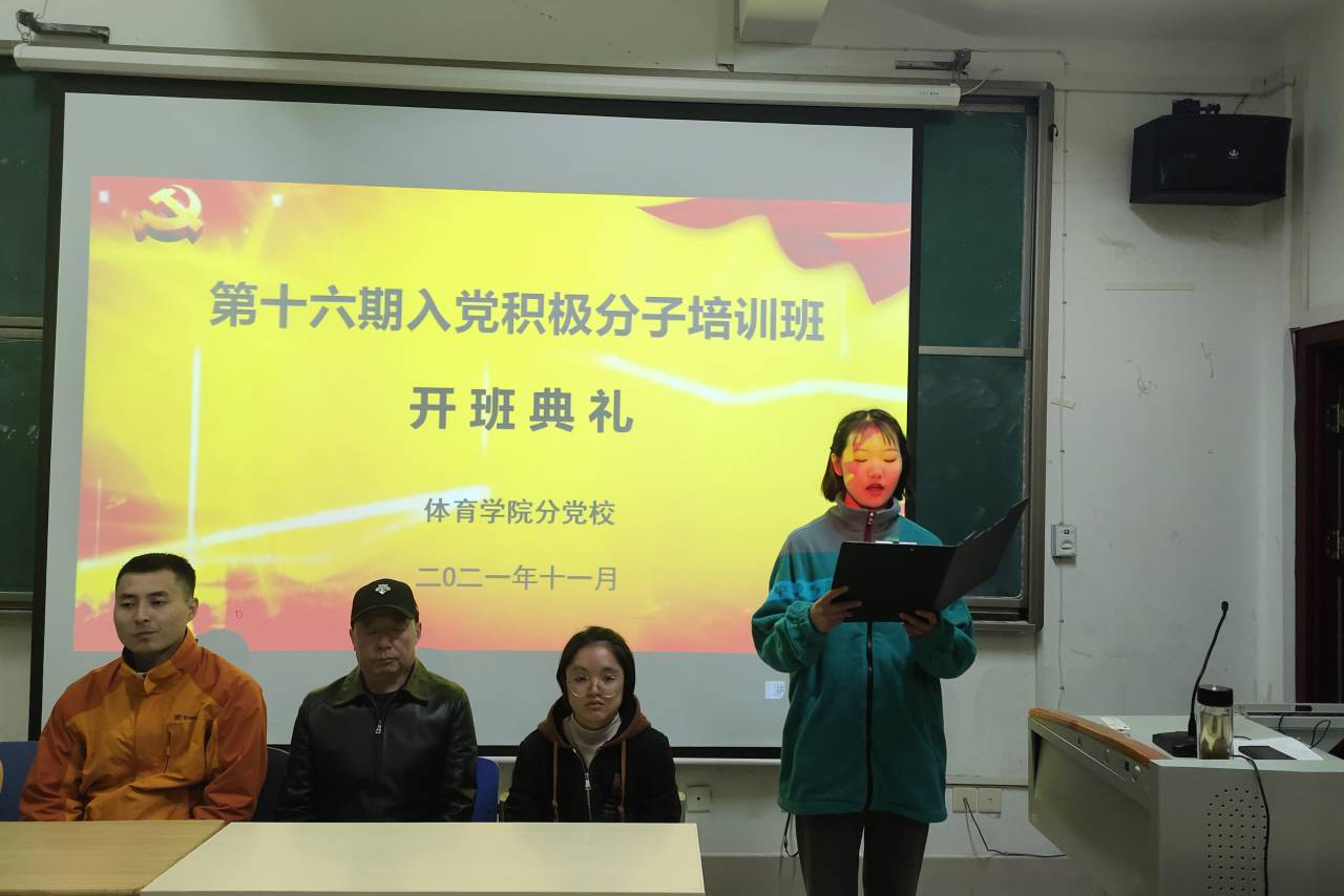 11月8日下午,体育学院第十六期入党积极分子培训班开班仪式在体育学院多媒体教室举行。体育学院党委书记汪思华、团委书记赵永兴、学生第一党支部书记林潺,学生第二党支部书记陈海燕出席了开班仪式,开班仪式由专职组织员马力主持。