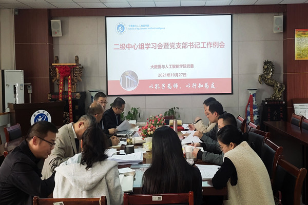 10月27日下午,大数据与人工智能学院在博奕南一楼会议室组织召开二级中心组理论学习会暨党支部书记工作例会,二级中心组成员、各党支部书记参加会议,学院党委书记宛明高主持会议。