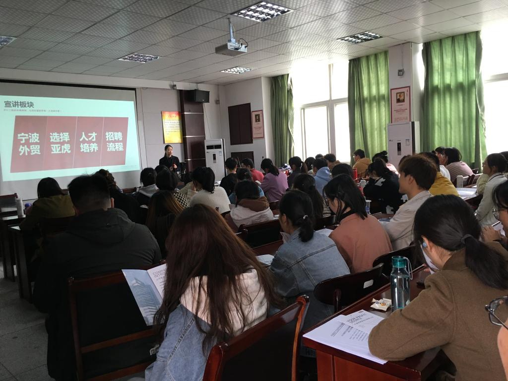 10月20日至22日,外国语学院在会议室、博学阶梯教室分别举行了宁波亚虎进出口有限公司、深圳摩罗志远科技有限公司、苏州易贝乐成长中心3场专场招聘宣讲会。通过前期宣传和动员,3场招聘会都座无虚席。