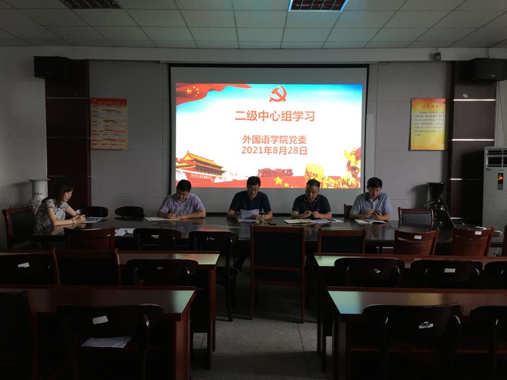 8月28日下午,外国语学院在会议室举行党委中心组集中学习。外国语学院党委成员、各支部书记参加了学习。会议由院党委书记张乐民主持。