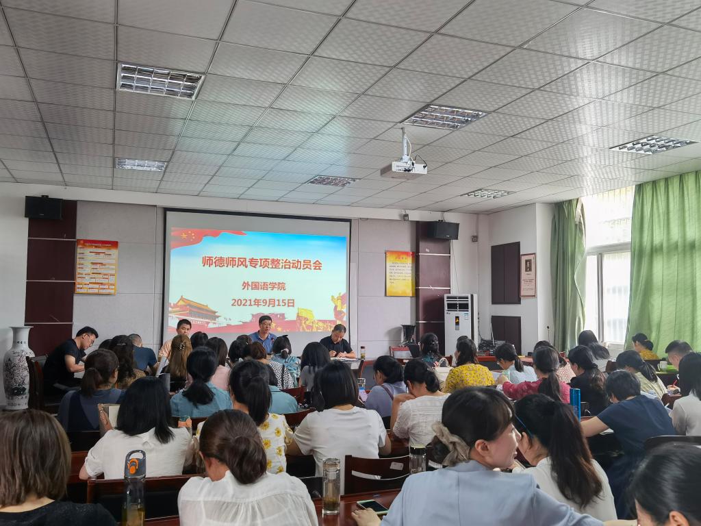 9月15日下午,外国语学院在会议室举行教职工大会,开展师德师风专项整治工作动员会。会议由外国语学院党委书记张乐民主持。