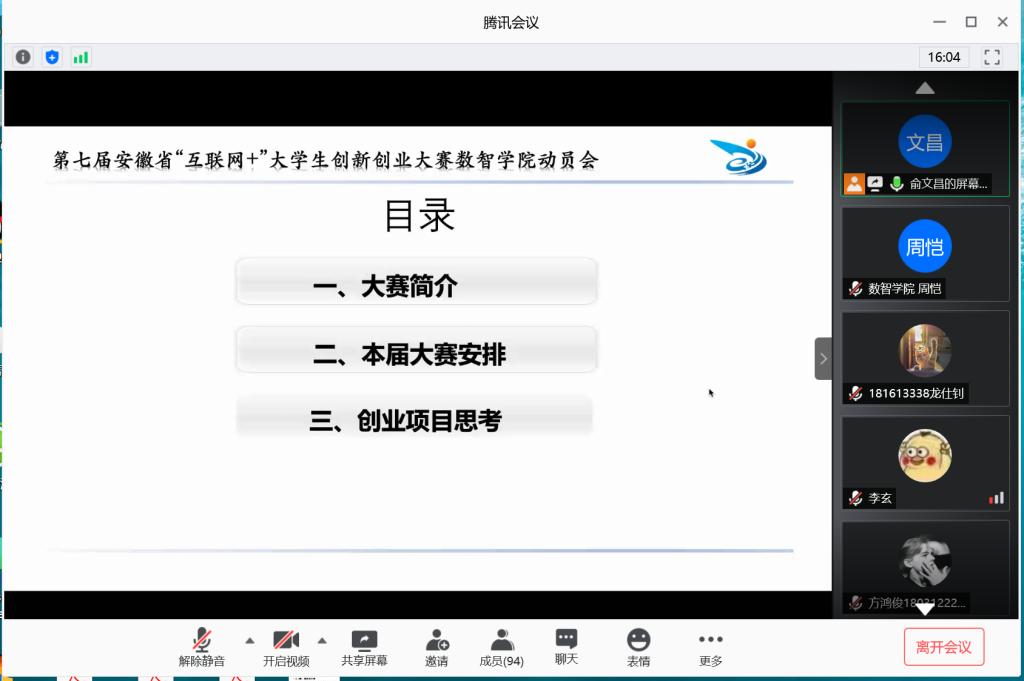 为深入贯彻习近平总书记视察安徽重要讲话精神,落实习近平总书记给中国“互联网+”大学生创新创业大赛“青年红色筑梦之旅”大学生的重要回信精神,深入推进学院大众创业万众创新,加快培养创新创业人才,大数据与人工智能学院于5月31日晚开展“互联网+”大学生创新创业大赛线上培训,学院副院长周恺、主讲教师俞文昌及兴趣小组100余名学生参加。