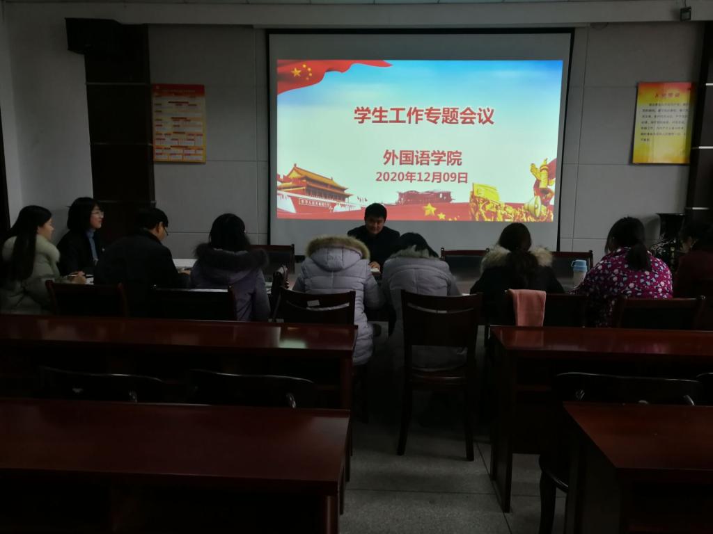 12月9日下午,外国语学院举行学生工作会议,传达学校学生工作会议精神、布置近期学生工作,外国语学院全体辅导员参加了会议。会议由外国语学院党委副书记刘军主持。