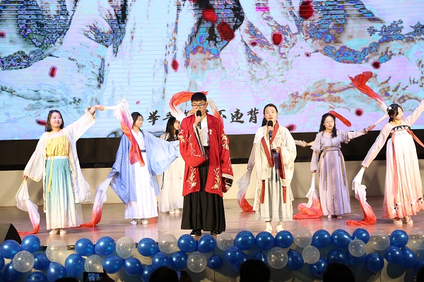晚会在一曲动感舞蹈《Maria》中拉开了帷幕,精心的编排、惊艳的舞姿洋溢着热烈的青春气息,也点燃了观众的热情之火。传统乐器二胡与流行歌曲的碰撞、充满古典韵味的扇子舞、优雅浪漫的华尔兹、富有活力的拉丁舞无一不展现着学院学子的艺术修养和积极向上的精神风貌;茶艺表演《云开照萬川》展现了中国茶文化的博大精深;相声《新语新说》串讲日常生活用语,风趣幽默,在欢声笑语中阐释着中国语言文化的独特魅力;话剧《疫中人》刻画还原了新冠疫情期间学院师生的学习工作状态,重现了众志成城抗击疫情的英勇壮举;学院党委共建单位——杨安社区带来的独唱《小白杨》和黄梅戏《春蚕到死丝不断》更是声情并茂;学院18位女教师带来的绝世风雅的旗袍秀,强大的阵容,曼妙的身姿,优雅的仪态,瞬间点燃了观众的激情,也将晚会推向了高潮。
