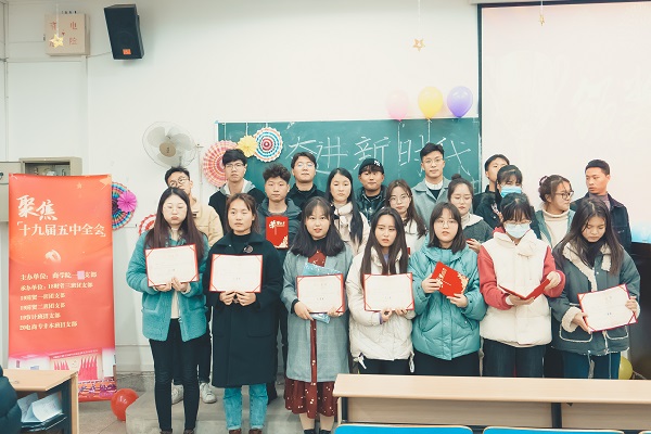 为深入学习宣传贯彻党的十九届五中全会精神,引导广大团员青年全面理解党和国家事业取得的非凡成就,激发奋斗精神,更好地将个人理想融入全面建设社会主义现代化国家新征程的大局之中。11月24日下午,在商学院学生第一党支部的指导下,18财管3班团支部、19国贸1班团支部、19国贸2班团支部、19审计学班团支部、20电商专升本班团支部联合开展“奋进新时代,争做好青年”主题团日活动。