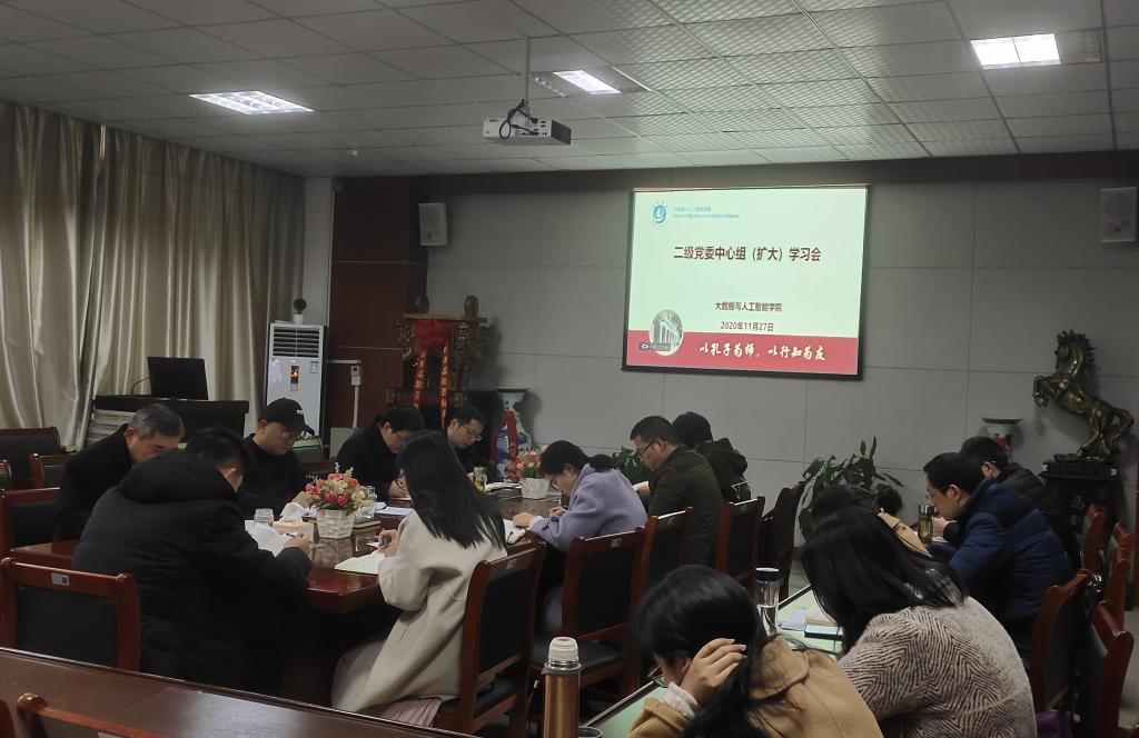 11月27日上午,大数据与人工智能学院在博奕南会议室召开二级中心组(扩大)学习会,中心组成员、院团委书记、院分工会主席、各支部书记以及专职辅导员参加会议,院党委书记宛明高主持学习会。