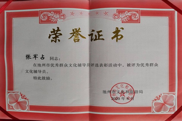 根据池州市文化和旅游局下发的《关于池州市优秀群众文化辅导员评选表彰的通报》,旅游与历史文化学院张军占老师荣获了池州市“优秀群众文化辅导员”称号。