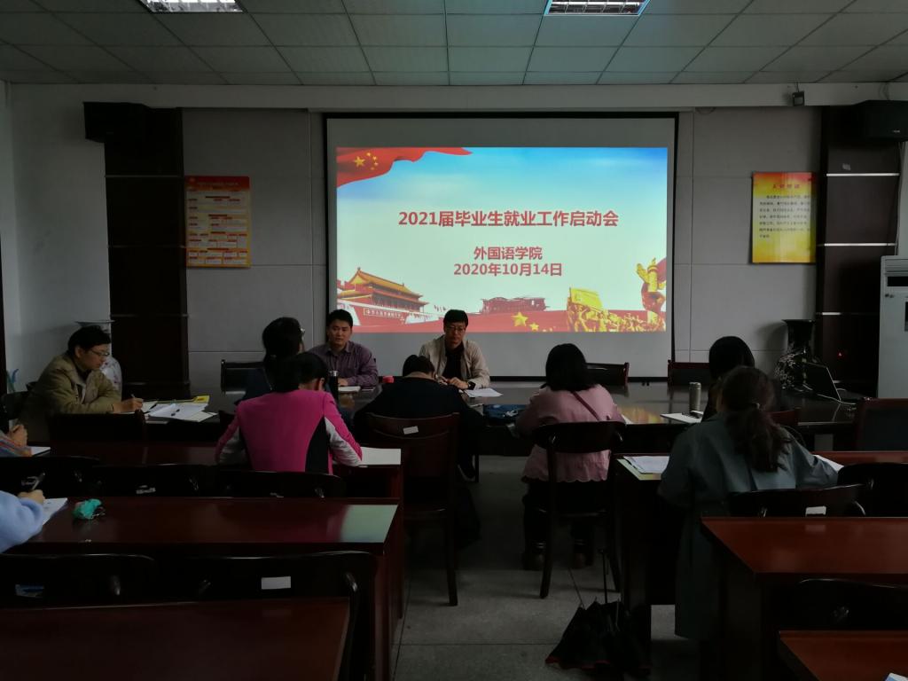 10月14日下午,外国语学院在会议室举行学生工作会议启动2021届毕业生就业工作。参加会议的有外国语学院党委书记张乐民、学工办主任和全体辅导员。会议由党委副书记刘军主持。