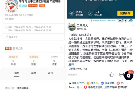 此次活动秉持“弘扬五四精神,讴歌时代力量”的理念,以展现当代大学生“继往开来、努力进取、创新求实”的时代精神为主旨,以“学习寄语精神,勇于责任担当”为主要内容,要求同学们在线上平台发表学习“五四寄语”的体会与感想。