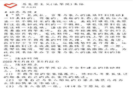 为进一步增强传承中华民族传统美德的责任意识,营造和谐美满的家庭氛围,让“加长版假期”更有意义。5月18日至5月22日,马克思主义学院(法学院)组织开展“‘照’见成长,分享温情时刻”活动。