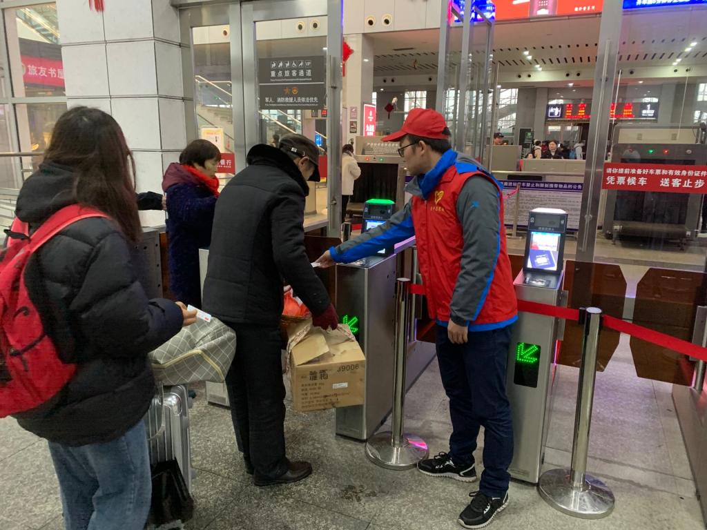 志愿者们在各个车站青年志愿者服务台,回答旅客咨询,在进站口引导旅客到候车区有序候车,在进出站口、上下楼梯口疏导旅客,保持通道畅通。为旅客提供引导咨询、秩序维护、重点帮扶、便民利民、交通安全法律法规普及、安全文明出行宣传、文明劝导、应急救援等服务,减轻春运拥堵等现象。