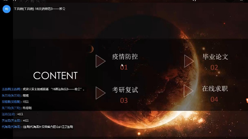 因疫情影响,毕业班学生无法外出找工作,各毕业班辅导员积极将各类就业信息传达给学生、组织同学们参加云招聘活动、积极帮助同学解决就业方面的疑问和困难,定期召开就业主题班会。16英语(师范)3班王昌俐老师积极收集学生关于就业方面的疑问,并咨询学院寻求解决办法,同时举行专题班会,激励大家积极就业。
