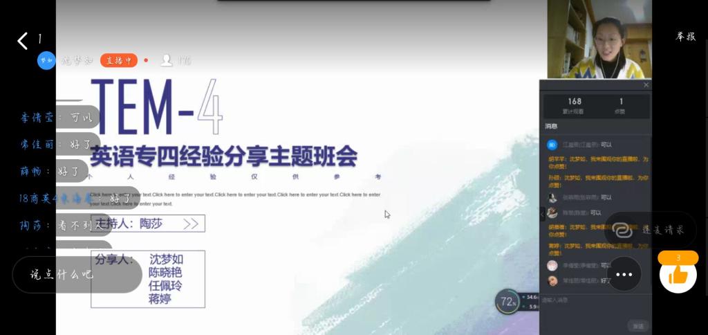 疫情期间,外国语学院各班辅导员都会督促学生学习,针对特殊学生特别关照,时常联系并咨询学习情况,并鼓励他们努力学习,通过帮扶提升他们学习兴趣。同时定期召开班会总结班级学习情况,如辅导员陶莎老师,针对18级学生本学期要参加英语专业四级考试契机,邀请4位高年级同学通过网络平台为18级180多名同学分享英语专四经验、交流学习心得。