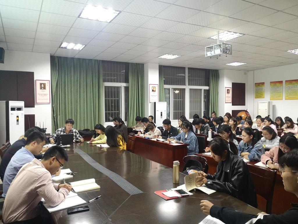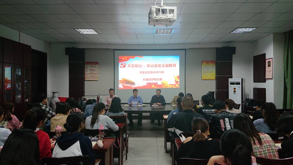 为深入推进“不忘初心、牢记使命”主题教育,加强对学生党员教育和管理,10月23日晚,外国语学院党委在会议室举行 “不忘初心、牢记使命”主题教育学生党员读书班开班式和第一次集中学习。外国语学院党委书记张乐民、学生支部书记和全体学生党员参加了开班式。开班式由外国语学院党委副书记刘军主持。
