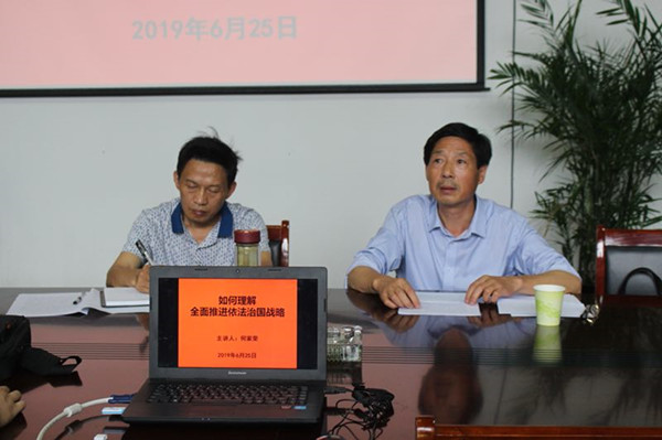 何家荣以“如何理解推进全面依法治国战略”为主题,从全面依法治国是“四个全面”的有机组成部分,是新时代党治国理政的总方略的有机组成部分,全面依法治国,必须解决好“全面”问题,全面依法治国,必须解决好“依法”的问题,全面依法治国,必须解决好“治国”的问题等四个方面,深刻剖析了全面依法治国的重大意义,深入阐明了全体人民既是法治社会的受益者,又是法治社会的建设者,只有全体人民都遵纪守法、所有公权力人员严格执法,形成法治国家、法治政府、法治社会一体建设的良好局面,中国特色社会主义法律体系才能日臻完善。