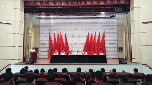 9月11日下午,机电工程学院2018级师生见面会在博古礼堂隆重举行。副校长汪贤才、校教学督导组成员王长春教授、学生处处长宛明高、教务处副处长许卫兵、机电工程学院院长孙佐、党总支副书记王永金、院长助理桂传友以及各教研室主任、教授、博士、专职辅导员等参加见面会。会议由王永金主持。