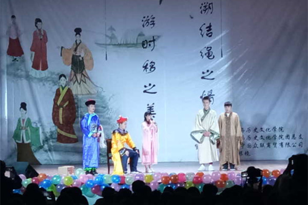 晚会在开场舞《精忠报国》中缓缓拉开帷幕。鼓声气势如虹,舞蹈绵柔有力,刚劲与柔美的结合较为准确地诠释了阴阳之道的文化内涵。历史剧《文成公主入藏之别样和亲》,语言诙谐幽默,赢得台下观众笑声不断;中场走秀《时光》展现出时代变迁中人们服饰的变化,勾起了观众对特定历史时期中服饰文化的回忆。《话说文管》借助双簧特定的艺术表演方式道出了文化产业管理专业特有的专业价值与专业魅力,可谓妙趣横生。讲述李清照与赵明诚爱情故事的情景剧《茶缘》,将诗、书、琴、茶、花等中国文化元素巧妙地结合在一起,和而不同。旅游与历史文化学院四位老师小合唱《相亲相爱的一家人》为全校师生送上了别样的祝福与关怀。手影舞《光影之旅》借助光线明、暗的差异性对比,营造出另类的舞台效果。小品《投其所好》以相关热点新闻为创作来源,既讲述了导游职业的艰辛,又善意的提醒我们现实生活中要善于甄别选择旅行社推出的旅游产品。最后,晚会在大合唱《我的梦》中落下帷幕。