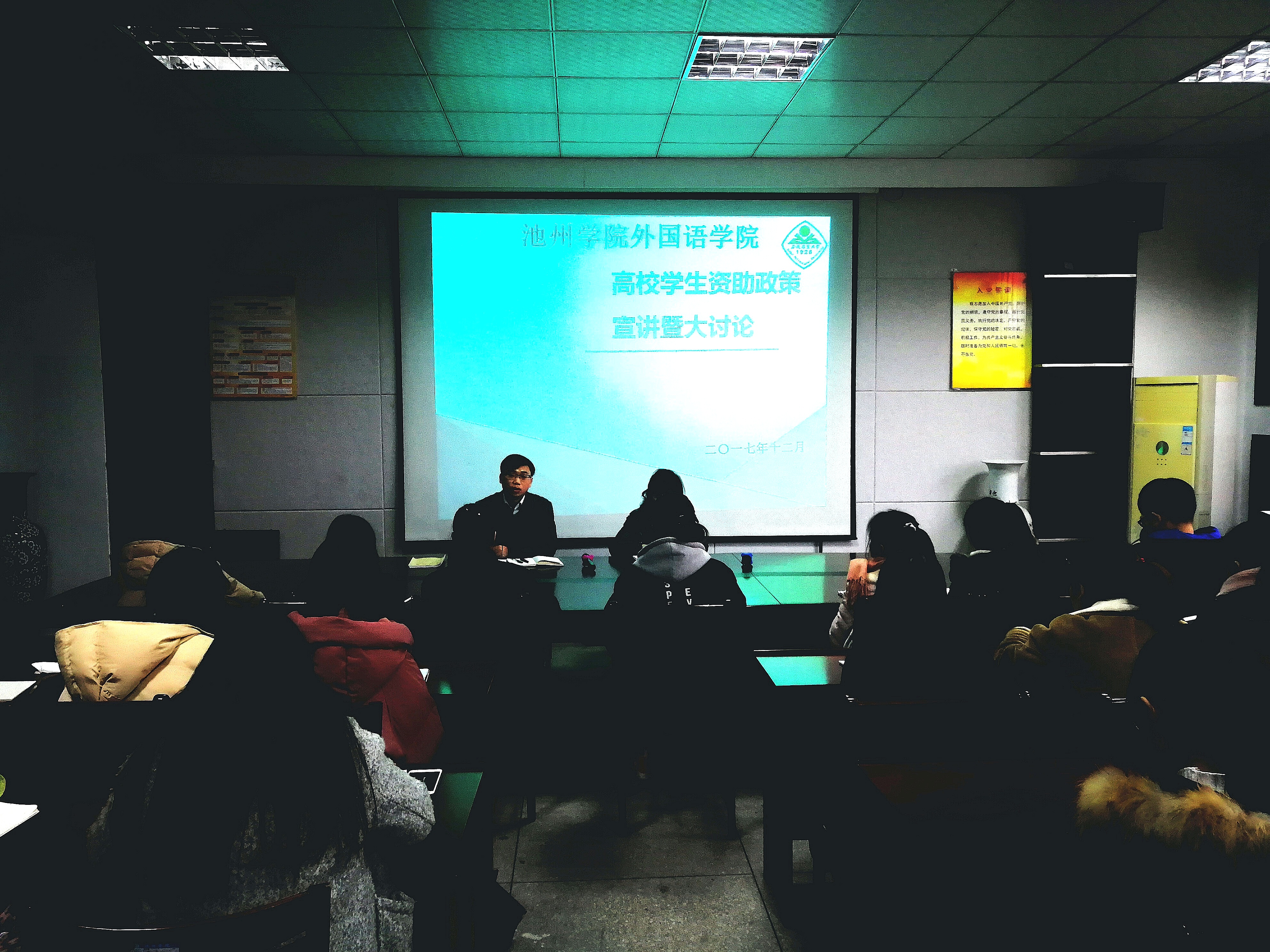 会上,苏翔传达了安徽省教育厅《关于在全省学生资助战线开展“学习贯彻十九大精神全面提升资助工作水平”大学习大讨论大实践活动的通知》文件精神,系统介绍了国家、学校的资助政策与体系,对十九大提出的教育脱贫实现教育公平的精神进行宣讲。