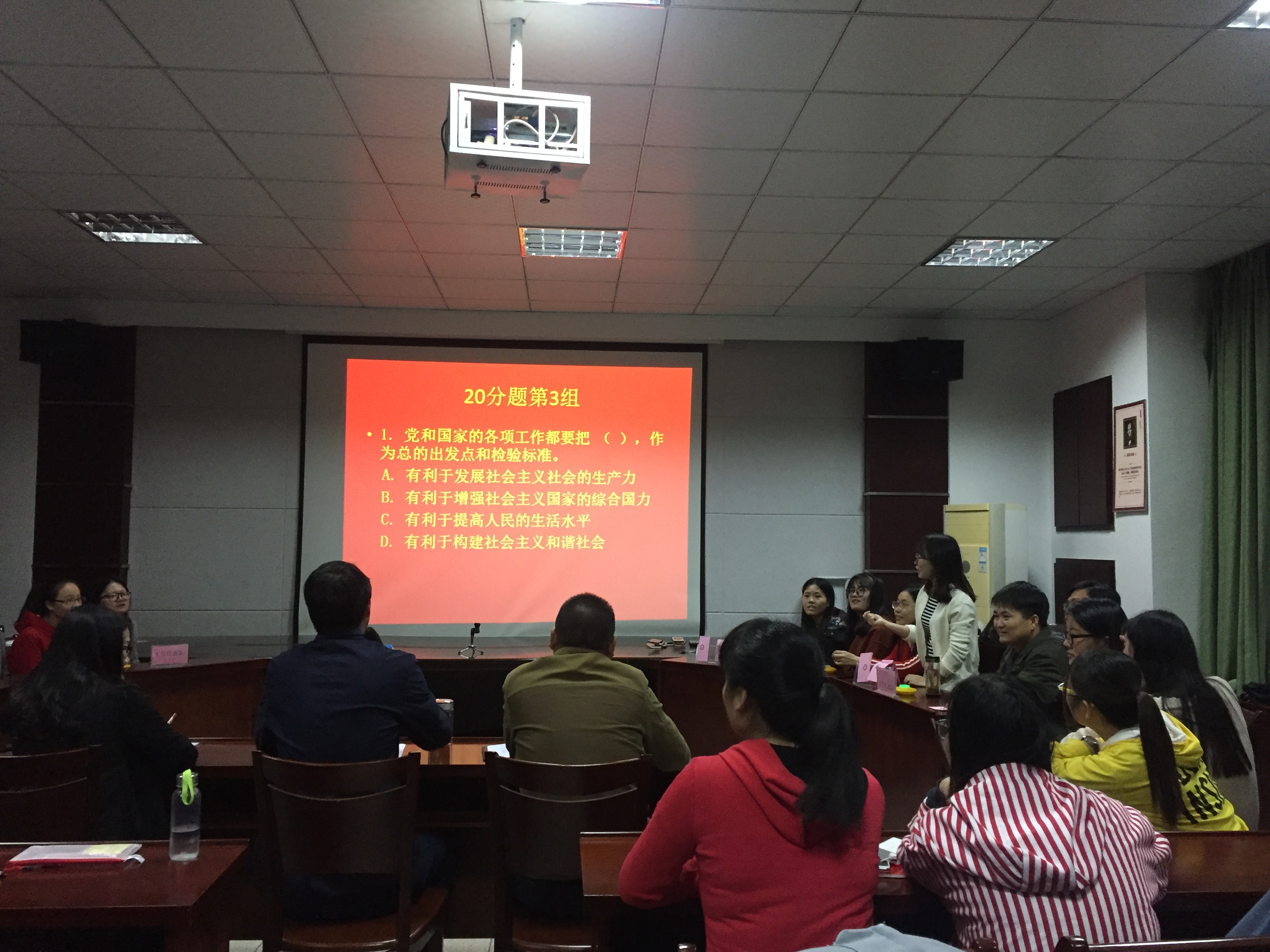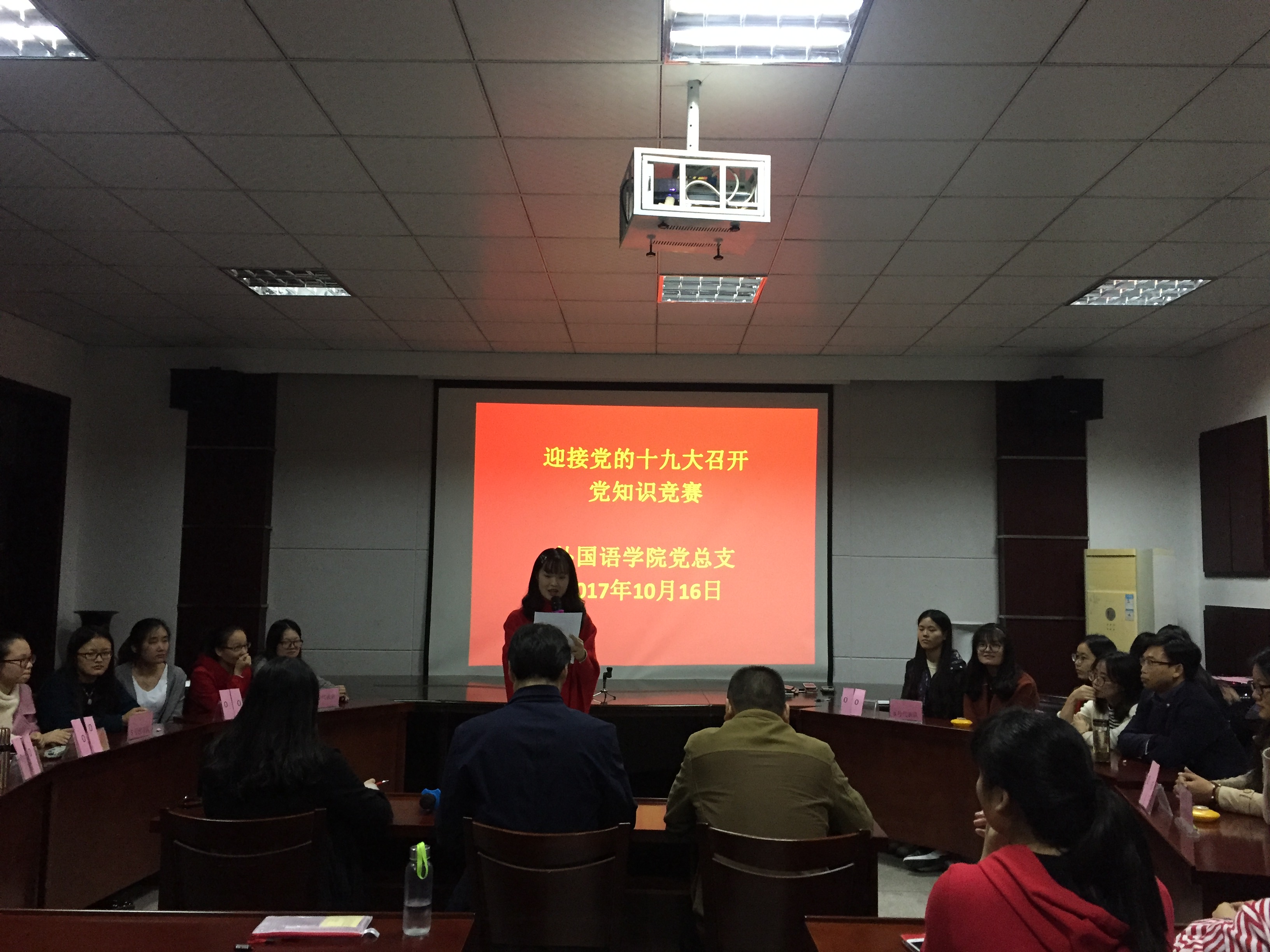 为深化“两学一做”学习教育、迎接党的十九大胜利召开,积极教育引导广大党员学党章、学习习近平总书记系列重要讲话精神,用理论指导实践和推动工作,充分发挥共产党员的先锋模范作用,10月16日晚,外国语学院党总支在会议室举行迎接十九大党的知识竞赛活动。