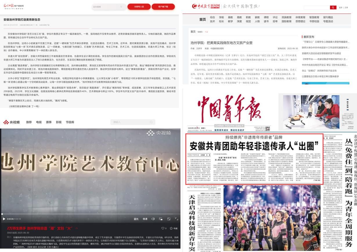 近年来,学院依托艺术俱乐部、非遗大师工作室、校企(地)合作基地等平台,与池州市文旅部门及多家企业签署合作协议,通过校地联动、校企协同,解码文化基因,反哺乡村振兴,助力非遗从校园走向景区、街道、乡村,为池州文旅注入青春动能,推动教学与市场贯通。学院将持续深化美育创新,以文化传承赋能区域文旅升级,以艺术教育滋养乡村振兴,为服务地方高质量发展注入持久动能。