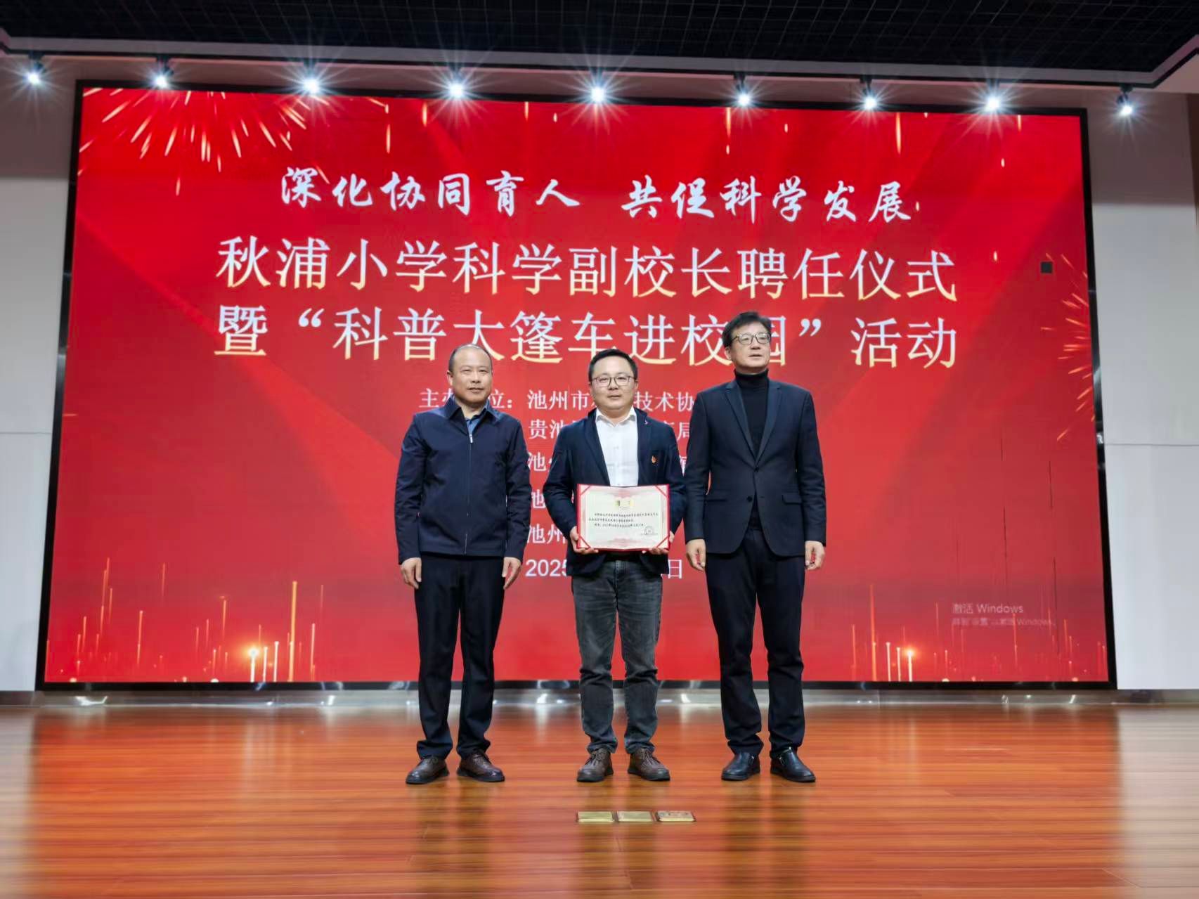 10月28日,池州市贵池区秋浦小学“科学副校长”聘任仪式暨“科普大篷车进校园”活动在秋浦小学多功能报告厅成功举行。池州市科学技术协会主席徐启明、池州市科技馆馆长汪琴、秋浦小学校长钱七二、best365手机版官方网站材料与环境工程学院副院长肖新乐,以及两校师生代表出席本次活动,活动由秋浦小学副校长陆正华主持。