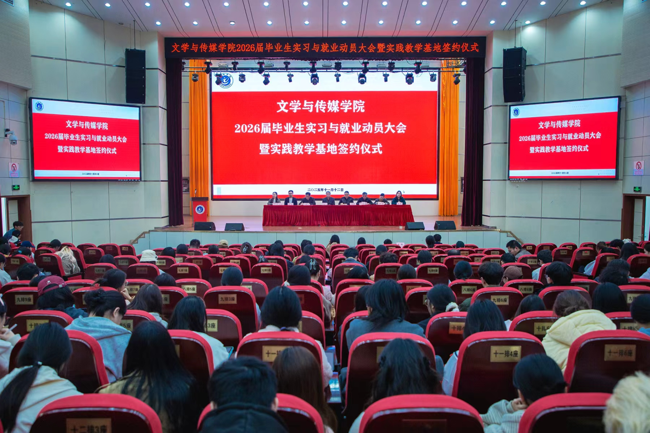 为扎实推进毕业生实习与就业工作,深化校企合作,提升人才培养质量,2025年11月12日下午,文学与传媒学院在博古礼堂举行2026届毕业生实习与就业动员大会暨实践教学基地签约仪式。学院领导、系主任、教师代表、毕业班辅导员、2026届全体毕业生以及多家合作企业代表共同出席了本次活动。会议由教学科研办主任胡庆玉主持。