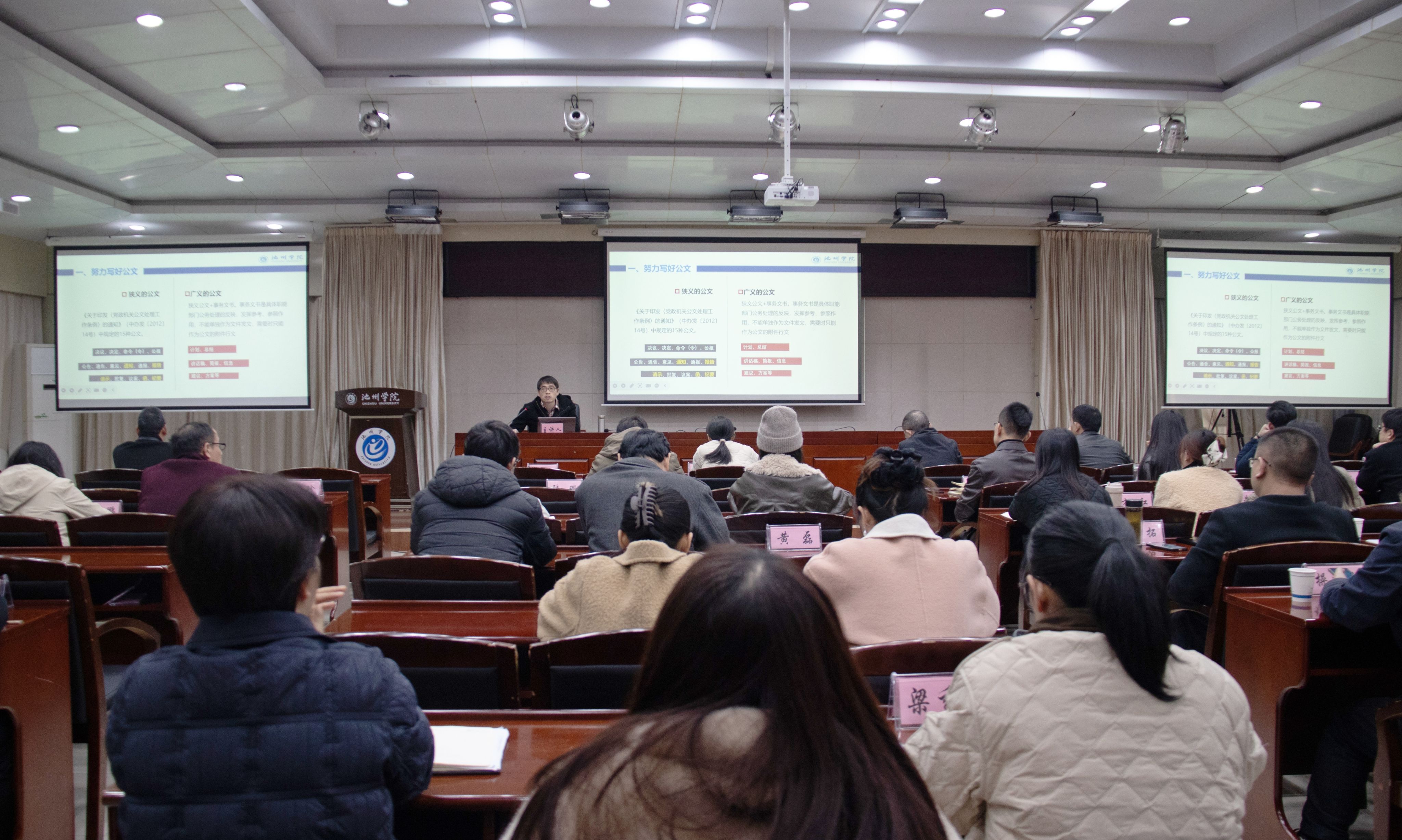 陈周庆系统阐述了公文的特点及其在学校行政管理中的重要作用,结合工作实际案例,详细讲解了通知、报告、请示、函、纪要、汇报材料等常用公文的写作规范、适用范围和注意事项,并对会议组织流程与关键环节进行了重点说明。