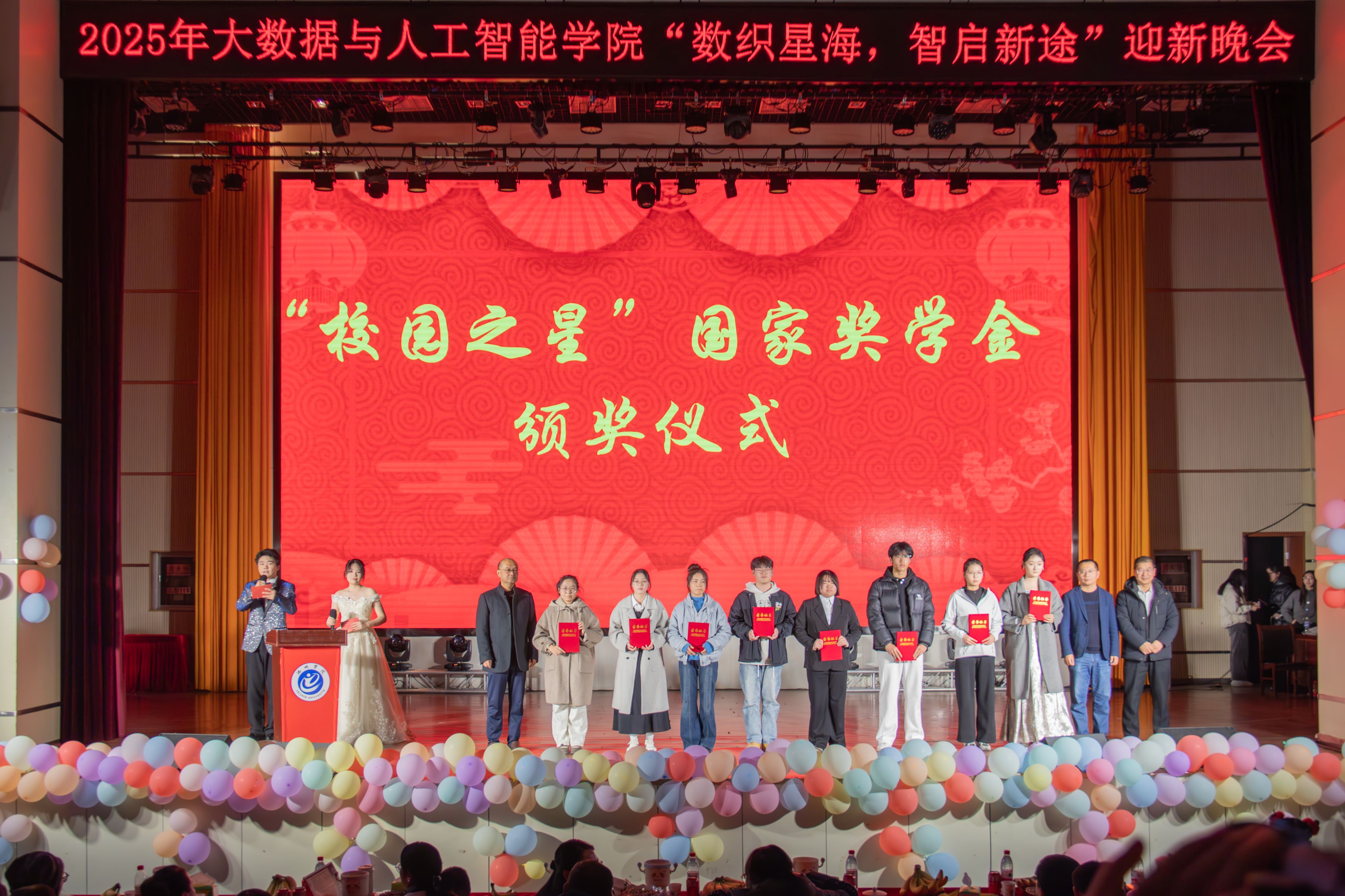 出席晚会的各位领导为“数智之星”“校园之星”“国家奖学金”获得者颁发了荣誉证书。这份荣誉,既是对他们过往努力的高度认可,亦是对全体学子见贤思齐、追求卓越的深切激励。最后晚会在大合唱《明天你好》的优美歌声中落下帷幕。