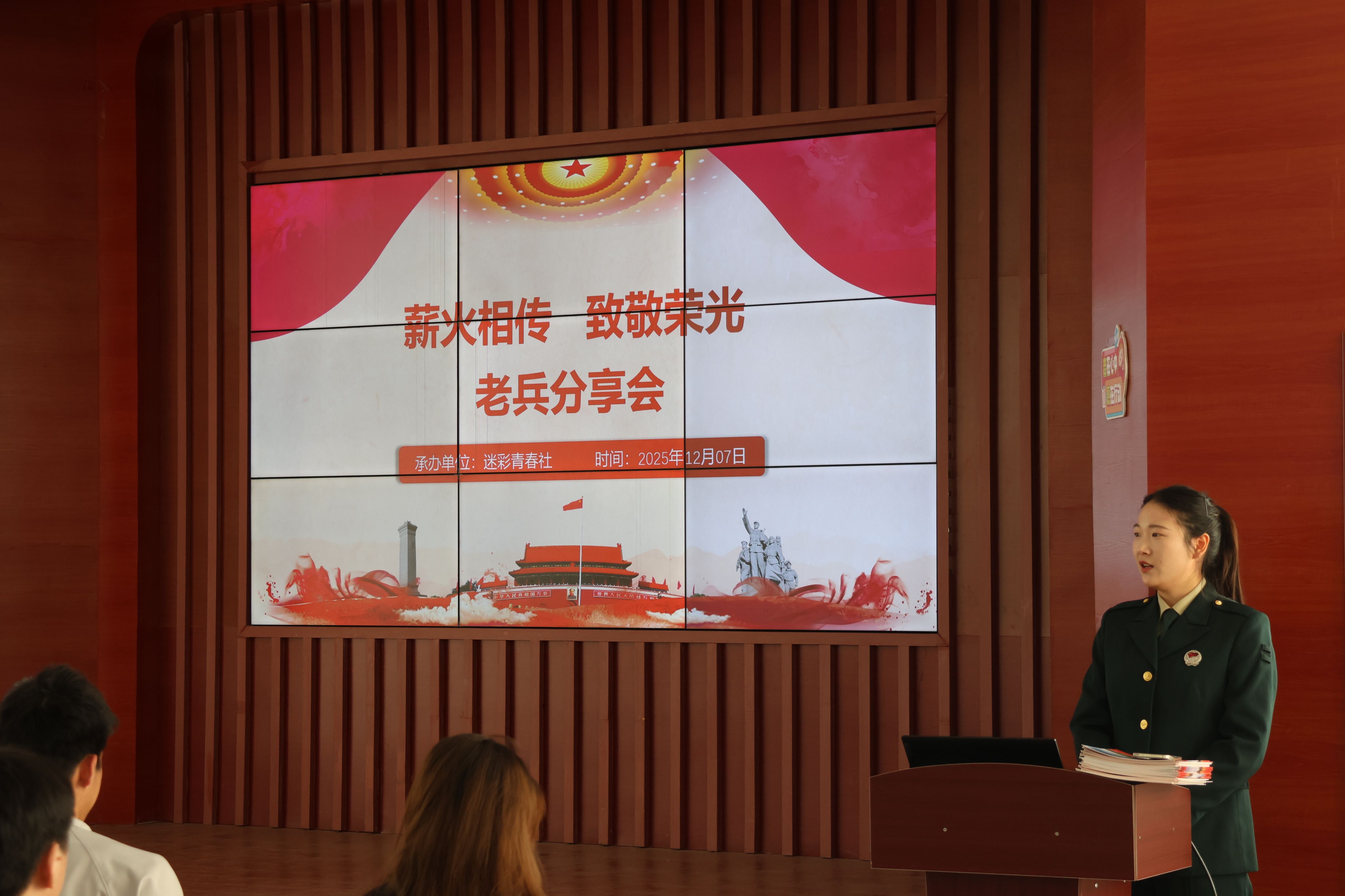 薪火相传致敬荣光。为推进2026年征兵动员工作,12月7日,学校征兵工作站(兵役服务站)在大学生活动中心举办“薪火相传 致敬荣光”老兵分享会。